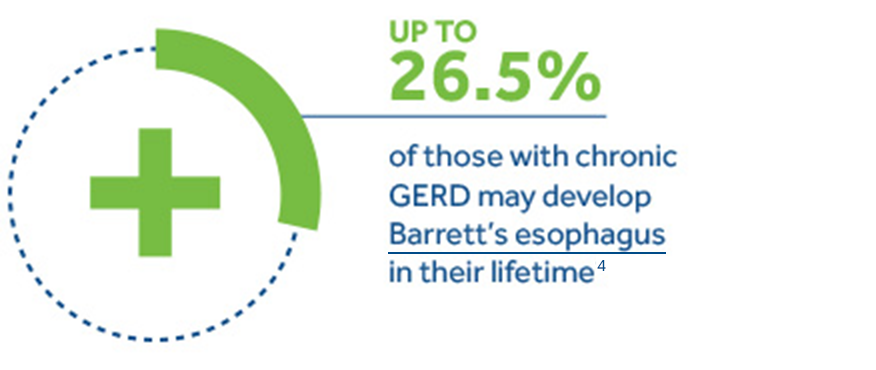 When diagnosis and treatment are delayed, chronic GERD can increase the risk for serious health complications, including Barrett’s esophagus and esophageal cancer.4 About 13% of Causcasian men over the age of 50 who have chronic reflux will develop Barrett’s esophagus.5